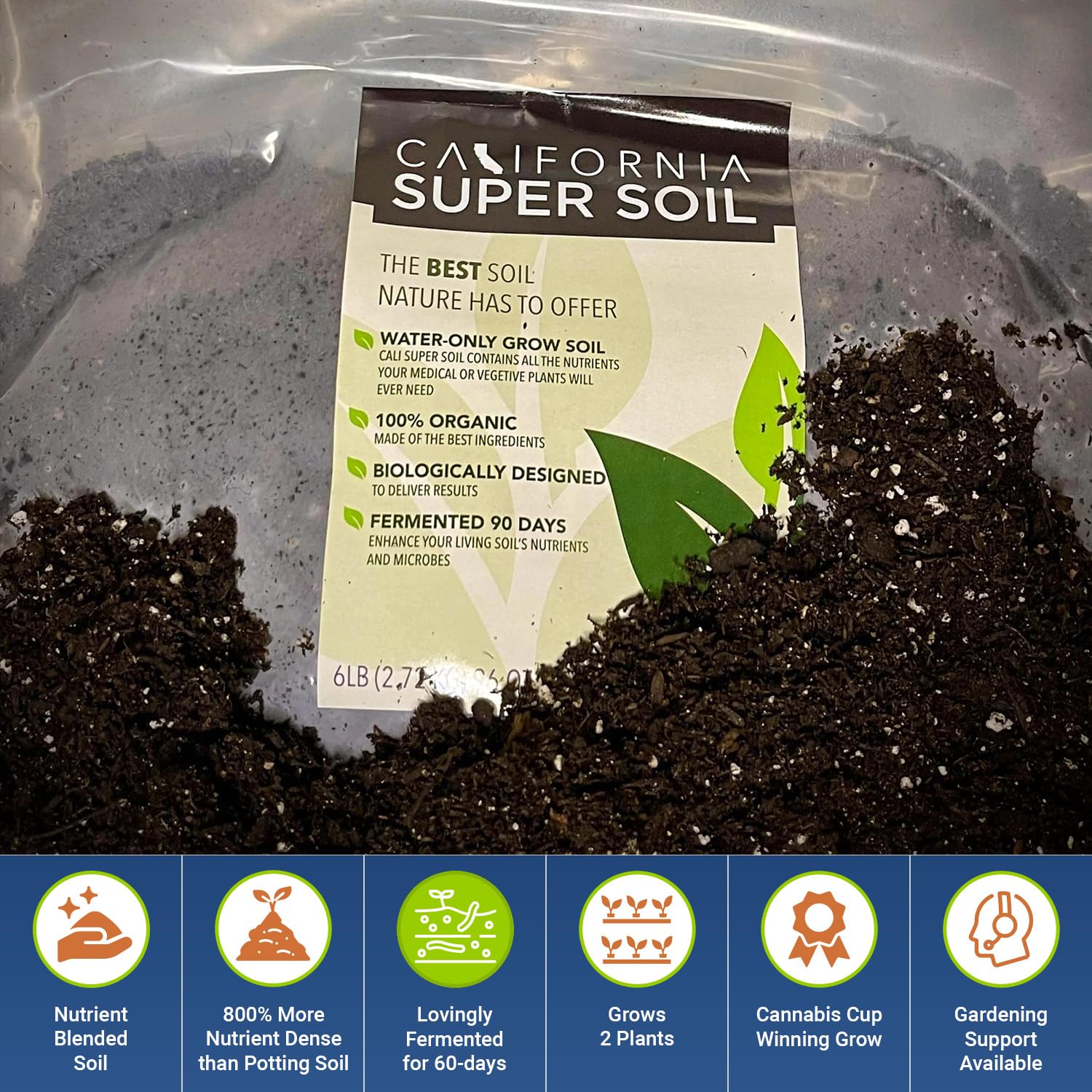 - STOP TRYING, START GROWING: California Super Soil is all you need for the best growing results! All ingredients are 100% organic, designed on a molecular level to be the perfect growing medium. You will never have to add any nutrients or worry about management all the way from seed to harvest. One-step solution to growing bigger, healthier plants with robust root structures.